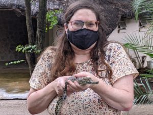 The crocodile farm had a whole snake room, which included both common, harmless types like the African brown house snake and the corn snake (which is very pretty, and a common pet in the US), as well as the serious vipers. Several species of cobra, puff adders, pit vipers, black and green mambas, as well as American cottonmouths and rattlers and coral snakes. They had an anaconda and a South African python who were friends and refused to be separated… they had been in adjoining tanks but the anaconda kept breaking through the wall between the two chambers and rejoining the python! Eventually, they just let them stay together. There was also another, much smaller python, which the guide offered to let me hold. I don’t think he expected me to take him up on it, but I did, and spent several minutes very happily petting a python while she draped herself all over me.