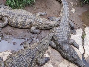 The croc farm breeds big Nile freshwater crocs… mostly for leather, but the deal with the government is that you have to return two percent of your babies to the wild if you took any eggs from the wild to start out. So they have a leather element and a conservation element, and a tourism element too, as they let people in to see the crocs as well as the other animals they keep just for the visitors. We began the tour with baby crocodiles, which the guide let me hold. I was enchanted. A baby crocodile is surprisingly soft except on its back… its belly skin feels like a snake, cool and soft and smooth. They don’t seem to mind being held, though they do get squirmy eventually if you keep them too long. The guide said that usually by about three years old, they reach the point where it’s unsafe to handle them without special equipment. Crocodiles live about as long as a human, so a three year old croc is still very much a juvenile. They reach adulthood, like we do, at around twenty to twenty-five… but as long as they’re getting enough to eat, they never stop growing throughout their lives. So the humongous crocs you occasionally see in zoos are probably old fellas in their sixties or seventies.