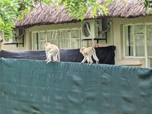 While I was talking to the guy who ran the cage diving activity, a small troupe of monkeys climbed the fence between the crocodile farm and the neighboring house’s back yard, where they’d apparently been playing with the drying laundry. There were four or five of them; a very pretty little species that the guide told me were called vervet monkeys. I hope I see more of them in my time here…. but if they’re common enough to be casually hanging out in somebody’s suburban back yard, I rather expect I will.