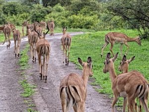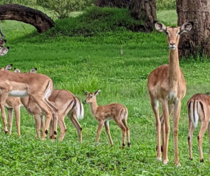 The first thing we saw was a herd of impala. Well, okay; they are actually the first thing almost everyone sees on safari. Impala are the most common type of antelope in Africa and there are zillions of them. But they really are beautiful, and to my great delight, they had a couple of calves with them. (I keep wanting to call impala babies fawns, because impala look so much like deer. But they’re really called calves.) One reason I came in the rainy season, despite it being harder to find wildlife then, is that it’s also baby animal season, and I wanted to see those! It looked like that decision was already paying off.