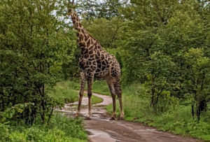 The kudu seemed to break the dry spell after the rhinos… there were more impala and zebras on the way back, plus a troupe of baboons all festooned over the branches of a big tree. The best of all, besides the rhinos, was the last thing we saw: on the way back to the park exit, there was a big bull giraffe standing right in the road in front of us. He clearly had a very tasty tree, and showed zero sign of wanting to move. Michael edged the van up closer, and the giraffe reluctantly pulled off to the side, but stayed with his tasty tree, super close to where we stopped the car. He even turned to look at us a few times.