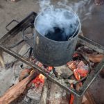 Cooking outdoors over a fire.