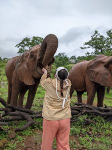 The sanctuary currently harbors seventeen elephants — some of them veterans of the original culling, others orphaned by poachers, and a couple born to their females when a wild male paid them a visit. They’re arranged in three herds, selected by the elephants themselves, who choose on their own whom they want to socialize with. I was introduced to a herd of five — a pair of matronly females named Janet and Emily, who were inseparable best friends; two younger females including one of Janet’s offspring, and a big old bull named Jock, who was one of the orphans from the original culling project.