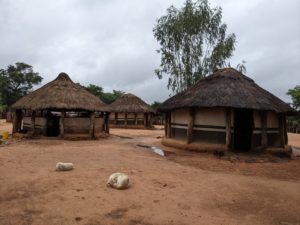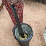 After a long discourse on the culture and lifestyle of the villagers, Mr. Nuwe took me around the rest of the compound. There was a summer kitchen, with much better ventilation than the winter one, and several houses which served as bedrooms for different clusters of relatives. Outdoors, there was a washing station, and equipment for crushing dried corn into cornmeal, which they let me try. Several dogs lay around the yard, indolent in the daytime. Their job is to wake the household at night if wild animals intrude. Free-roaming chickens and guinea fowl (a native bird often kept for egg production) poked at the ground for insects.