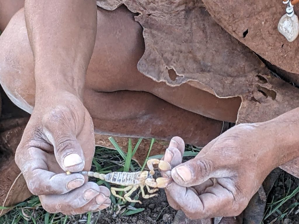 The Zhu/kwazi men told us how, when they were children, a favorite game was for each boy to dig up a scorpion and set them to fighting each other, to see whose arachnid would win. They actually dug one out for us, held it by the tail so it couldn’t sting, and showed us where its eyes are (it has eight, just like its legs) let us touch its belly, and one of them even held the scorpion briefly in his mouth! Then he released what was doubtless a very relieved scorpion to go back into its hole in the ground. I’m sure it believed it was about to be eaten, and I can’t blame it a bit. I never thought I would feel sorry for a scorpion, but I did for that one. We put the poor thing through a lot. But it did finally get to go home.