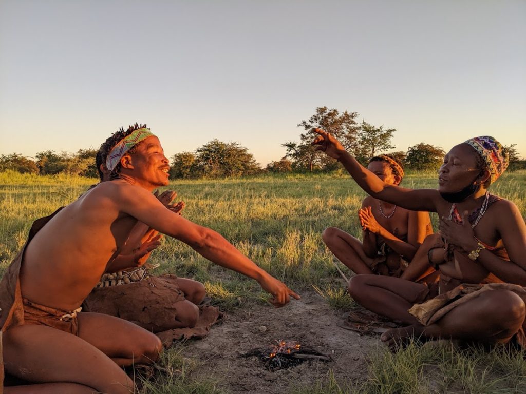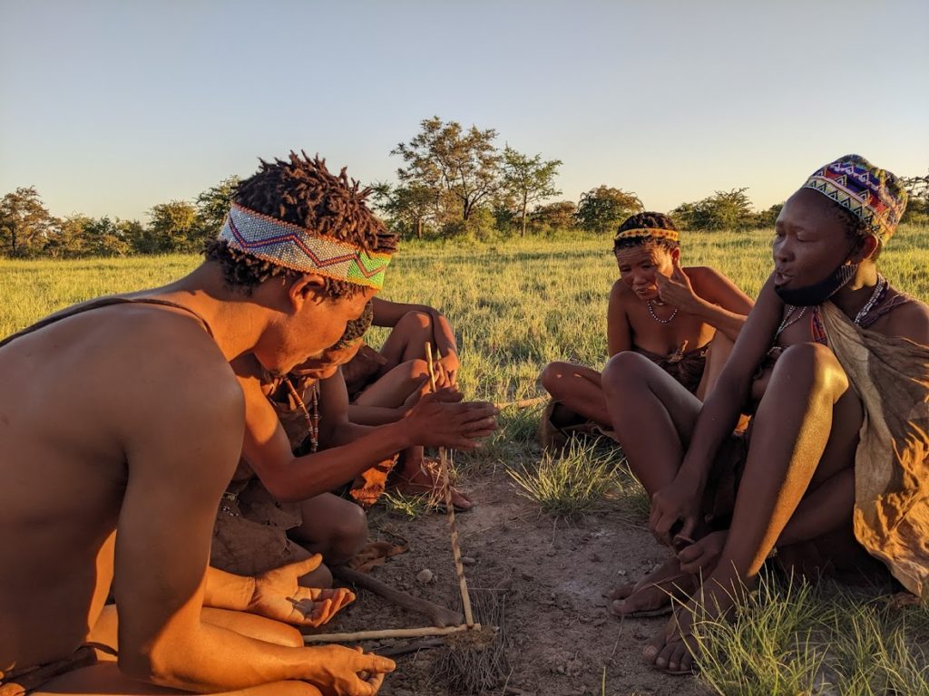 The last thing they did was to show us how they made fire sticks from a certain type of tree, and then built an actual fire to show us how they used those fire sticks. It was impressive. I’ve seen people build a fire by rubbing two sticks together before, but never with the easy speed and certainty that these folks showed. The five of them took turns and had a merry little blaze going in less than a minute. Then they played a traditional game among themselves over the fire. Neither the other guests nor I could understand most of what was happening in the game… the Zhu/kwazi said it worked along the same principle as rock/paper/scissors, but it also involved a lot of singing and clapping, and the actual moves of the game didn’t seem to happen simultaneously. I think part of the goal was to psych the others out about when exactly you were going to move. It sure looked like a lot of fun for those who understood it, though. They played men against women — two on two, while the third woman set up the jewelry display. This time, the men won, though they joked that they were still far behind in the ongoing contest!