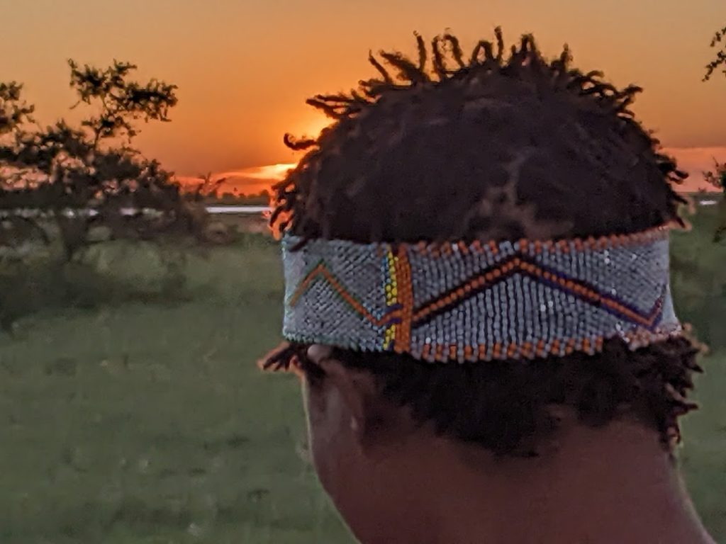 Just before they walked us back to the model village, where our safari van was waiting with Fabio in it, they showed us some of their beaded jewelry that was available for sale. I picked up a gift for somebody; and since I wasn’t carrying cash, I made arrangements to leave payment with the Jack’s Camp management before I depart. They’ll get it to the tribe.