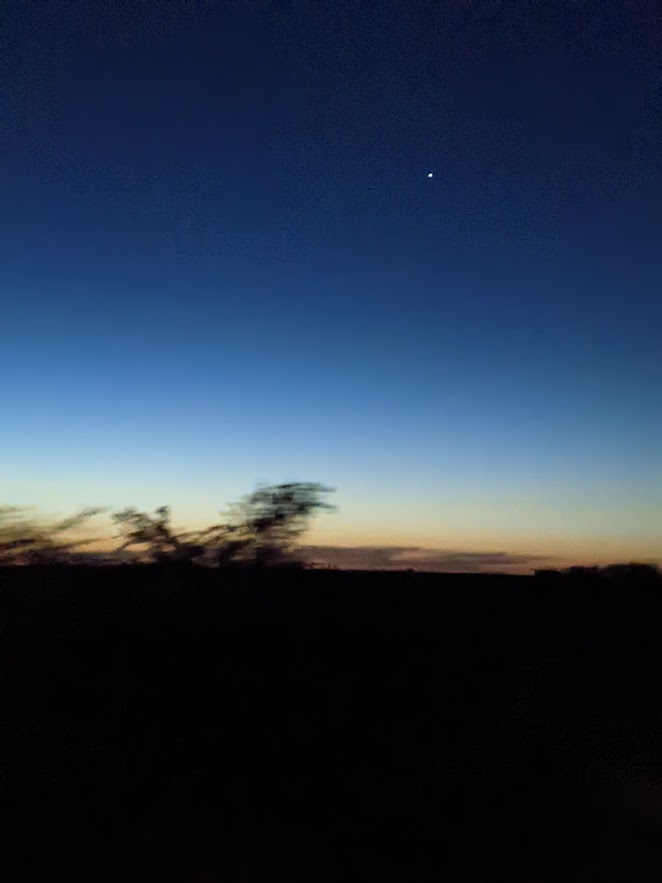 We didn’t do the intended night drive on the way back — Fabio had gotten one safari van stuck in the mud around here already that afternoon, and we decided we didn’t want to risk being the second. But we did have sundowners on the beach of one of the many shallow lakes created by the rains around here. It was beautiful, and I got a photograph that I really like of Venus, in her role as the evening star, just before nightfall. By half an hour later, it was full dark and the stars were as beautiful as I’ve ever seen them. It’s the southern sky, of course, and I don’t know their constellations, but just the dizzying number and brilliance of them, filling up the enormous desert sky like searchlights from very far away, was magnificent. I wish I could have gotten a picture of that but neither my phone’s camera nor the GoPro was good enough in low light to capture it well.