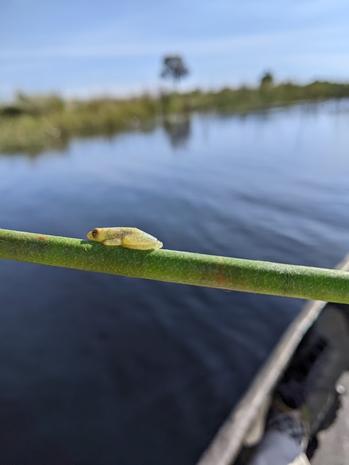 Because the Mokoro is flat-bottomed, it can afford to move in very little water. We glided smoothly along without incident, even when the bottom was only a couple of inches away. TJ told me about the wildlife we were passing, from the malachite kingfisher (I didn’t get a picture because it flew away before I could get out my camera, but it was beautiful) to a tiny green frog no longer than my thumbnail, who was living on a slender reed the same color as he was. TJ explained that these nocturnal frogs hide in plain sight by day, to keep from being eaten by birds of prey and similar dangers. It was certainly hard to see against the reed! I’m not sure if I would spotted him without TJ to tell me where to look. When I did see him, he was adorable, and I held him on his reed for a little while before returning him to the water.