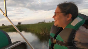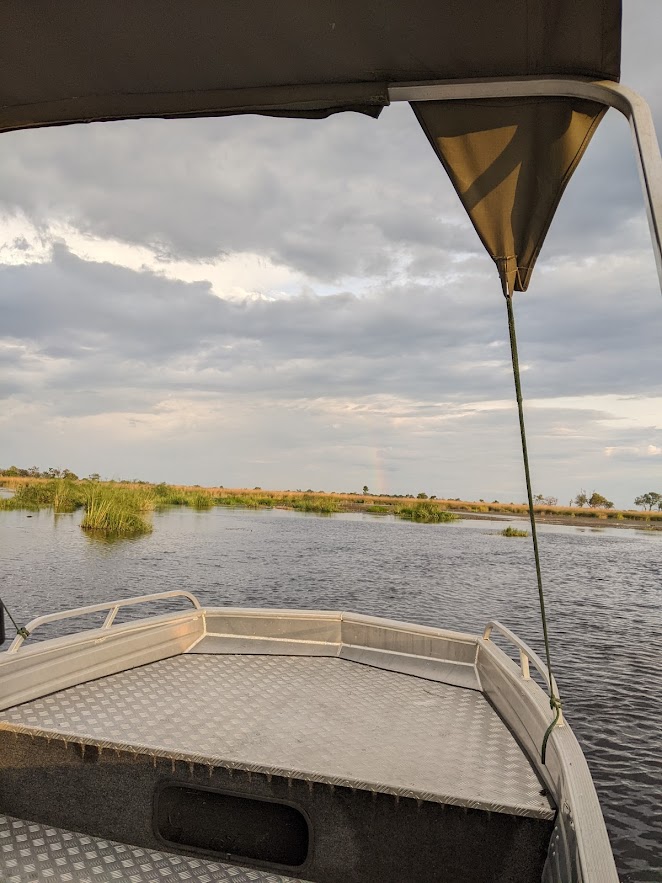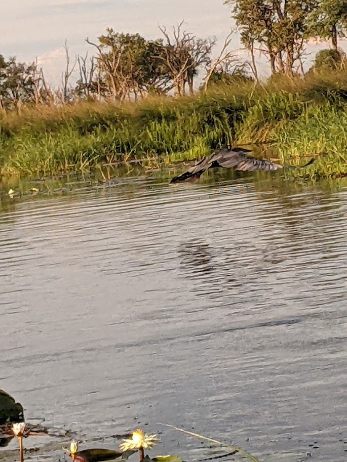 So we took the safari vehicle to the river, which is technically in the Moremi Game Preserve, a public park. We all climbed into an aluminum motorboat with a very limited sun shade and set out for the river. It was a beautiful place, but with the sun coming in low from the west — the side of the boat I was sitting on — the sun shade directly overhead gave me no protection at all, and since I still can’t use my sunscreen because I think it’s what caused the awful rash on my hands and arms, I had to hide the right side of my face and arm under my jacket.