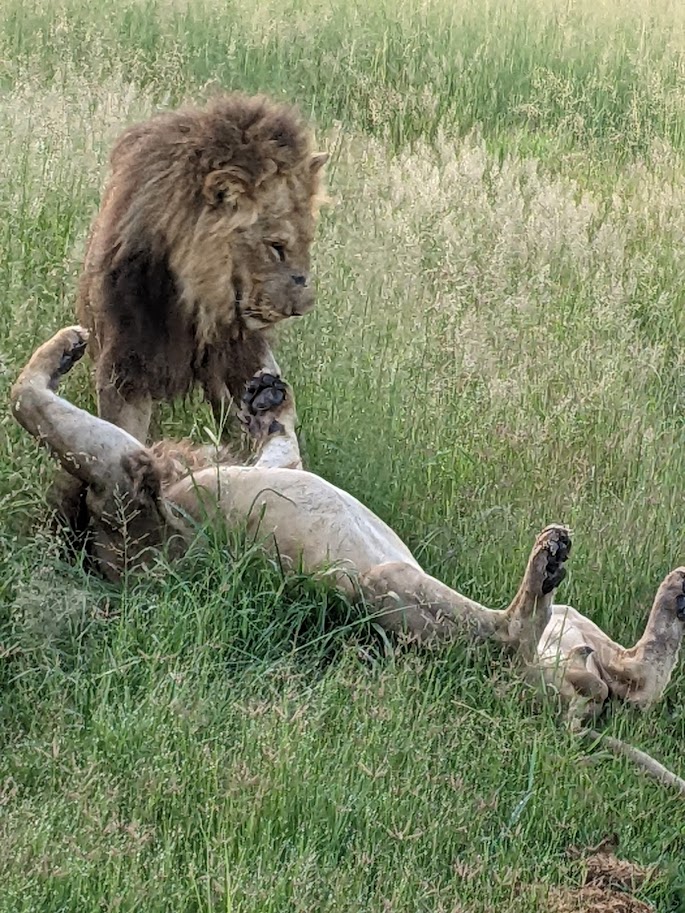 Lions roared around our camp all last night, and it was very shortly into the morning game drive when we found one. In fact we found two — both of them clearly visible, unlike last night. We first found one male we didn’t know; and then Gray-snout from last night joined him, and they washed each other happily for a while. TJ explained that they were two out of a coalition of five brothers who all collectively ruled this area. They each mated with all the pride’s females, and therefore each male regarded all the lionesses’ babies as his own. This kept the cubs safe from him, no matter whom the biological father really was, since a male lion would normally kill cubs who weren’t his own.