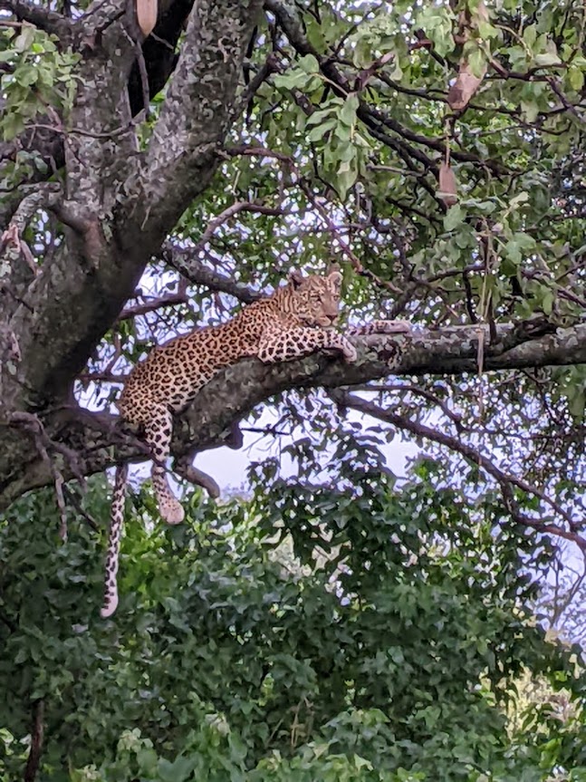 TJ took one look from a great distance, and said, “The leopard is there.” KP was still on the tracker’s seat, so we drove right past the tree in order to give him a safe chance to climb off and get inside the truck. Then we went back to look at our leopard.