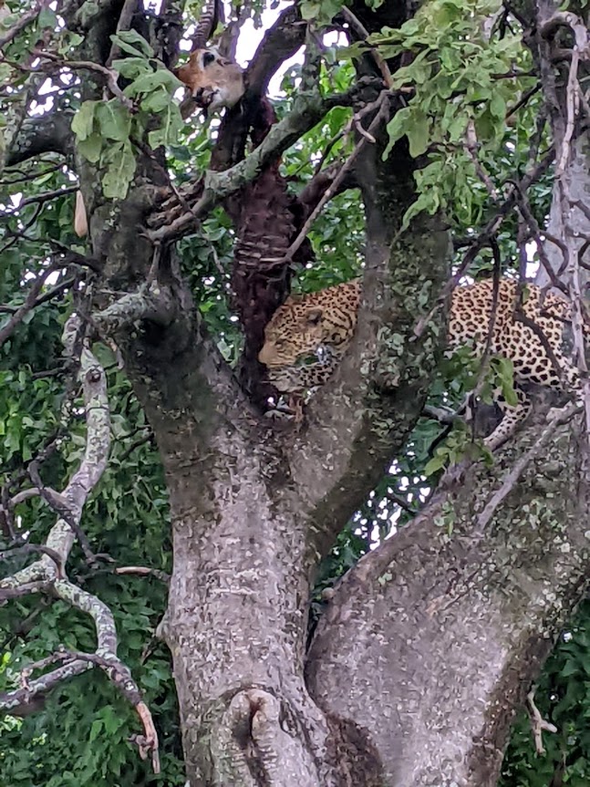 I looked eagerly to the left. I’d only seen one hyena before this, and it was at night, while the hyena was hunting, so we only caught a brief glimpse of it before it disappeared into the darkness. This one was scavenging from the leopard, or trying to, and it was very funny — it hung around beneath the leopard’s tree as if it were a dog begging scraps from the table. It was clearly hoping the leopard would drop a chunk of lechwe, and the leopard was just as determined not to. It was fascinating to watch the interaction between the two creatures, and thanks to TJ’s careful positioning of the van, we had a front row seat.