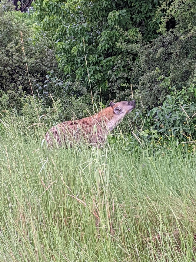 Leopards are elusive at the best of times, because they’re largely nocturnal and solitary, and they hide in trees when they’re not hunting. This was far from the best of times to find a leopard, since the rainy season offers them so many options. In the dry season, they have to come to the few available water holes once in a while, but at this time of year they can find water everywhere. We would never have seen him, if TJ hadn’t spotted his kill and gone back to see if he’d return to it. The leopard was asleep when we arrived, but soon woke up and looked at us suspiciously for a few minutes, before deciding we were all right and climbing through the branches to where he had left his lechwe carcass. He began, casually, to munch on it. We remained, transfixed by the beauty and power of the big cat, until KP — who had kept his wits about him and was still doing his job — said, “Hyena on the left.”