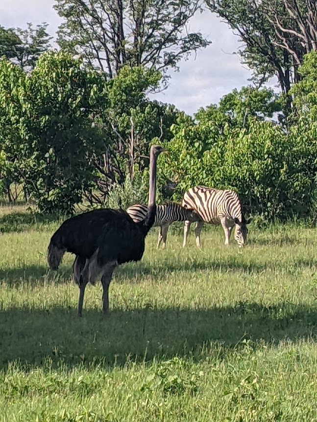 We left the jackals behind. (There was a reason we saw so many jackals, which we didn’t find out right away.) We then encountered several zebra herds, each with its one resident wildebeest. I think there’s some kind of rule: every zebra herd has to have exactly one wildebeest — no more and no less. One of the herds had a couple of ostrich parading around nearby as well. Prey animals appreciate ostriches; they can see very far, so they’re good warning of approaching predators. It’s also one reason why the lone wildebeests like to live with zebra herds. It’s hard to get much to eat safely, when you have no other eyes to protect you. In a herd, whatever the species, others can watch your back sometimes.