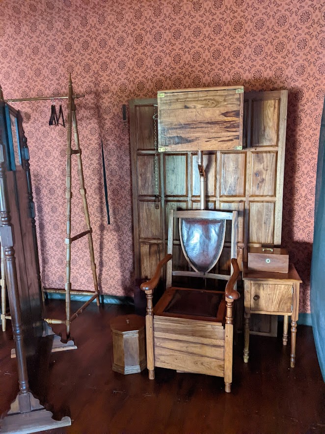 At the entrance, I have a small antechamber with an assortment of walking sticks and umbrellas, a portable lantern, and a set of ornate wooden bookcases stocked with my own personal mini-library. Next comes a sitting room with a velvet sofa, a canopied daybed, two armchairs, a long leather coffee table, and a fully stocked bar. (Also, more prosaically, a charging station for electronic devices.) After that, a bedroom with two queen-sized beds — classic English four-posters nicely accommodate the necessary mosquito netting — along with an armchair and ottoman, a dressing bench, a traditional Moroccan leather pouf — very useful for putting on one’s shoes — and an antique writing desk and chair in one corner. Finally, there’s a bathroom/dressing room combination. It has a shower behind a curtain on a brass rod, and a toilet made out of an antique armchair! behind a screen made of full-length mirrors. A pair of sinks lines one wall. The dressing room also contains a gorgeous velvet chaise lounge, and an antique wooden chest of drawers, surrounded by large leather-and-wood clothes racks. Outdoors, there’s an enormous shaded deck, containing a private plunge pool, two swinging day beds, two chaise lounges, and an outdoor shower. Scattered around inside the tent are Victorian antiques in everyday use, and curios from the Jack’s Camp museum in glass cabinets. Persian rugs carpet pretty much everything except the deck.