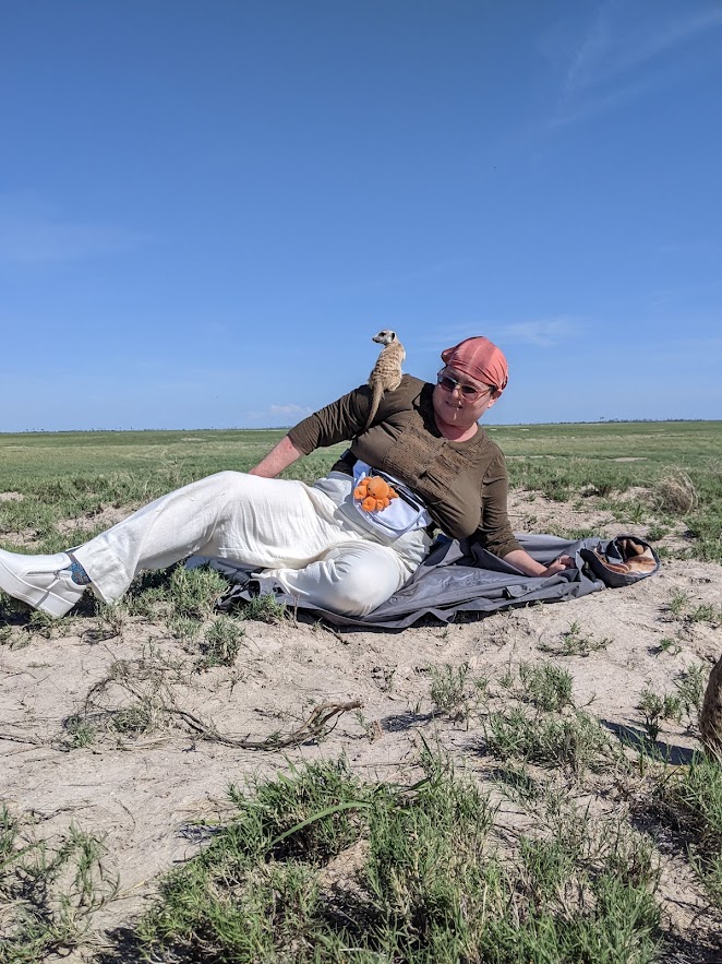 Meerkats are one of the very few species I’ve seen who behave in random daily reality exactly as they behave in nature videos. What’s more, they really DO habituate enough to climb onto passing visitors — one actually did climb me, and I have the photos to prove it! It’s completely enchanting to have a little wild creature trust you enough to scramble up your shirt and sit on your shoulder, even knowing that they don’t care in the least about you — you’re just the highest hill available in a very flat land.