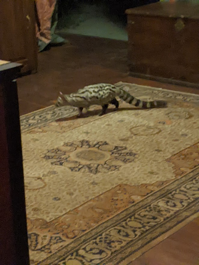 Frankly, Janet the genet seemed pretty determined to domesticate herself by main force, whether the staff liked it or not, but I appreciated their predicament. She did apparently manage to steal something once in a while, because she still considered it a good job to come in at dinnertime and see what she could get. She had kittens waiting back at her den to feed, and a mother’s got to do what it takes.