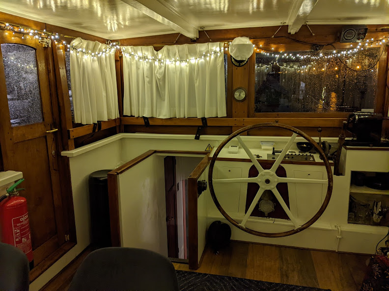 Inside the wheelhouse, looking at the entrance door and the stairs down to my room