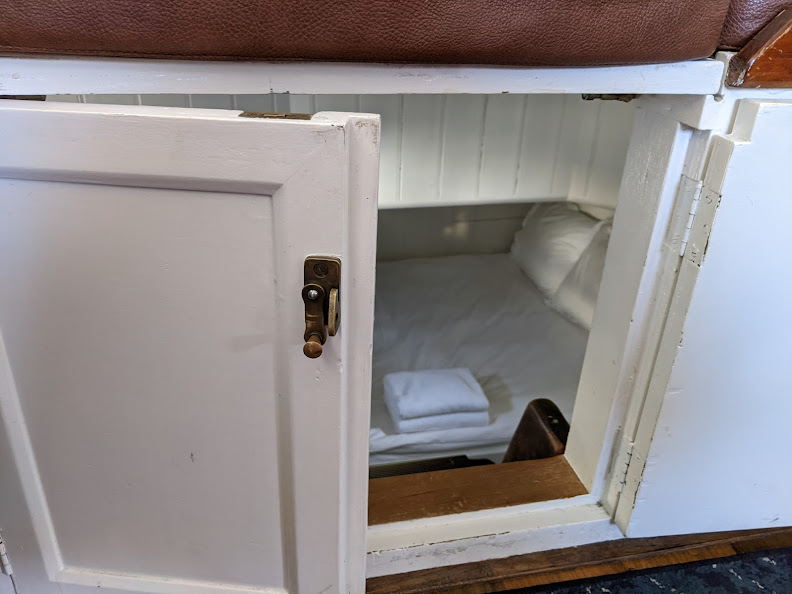 Originally, I had thought that was the whole boat. But I got a real surprise when I opened up a cabinet underneath the sofa in the wheelhouse… I found a whole additional bedroom down there!! It wasn’t a cabinet at all, it just looked like one. You could climb through the double doors and right down the ladder into the second room. I didn’t need a second bedroom of course, since I’m alone here, but it was a lot of fun to go poking around and find more than I expected. The boat is really cold — it’s got no insulation and February in the Netherlands is chilly! — but I pulled the quilt from the second bedroom into my room for extra warmth, and found a little ceramic space heater that warms the small rooms of the houseboat very nicely, so now I only get really cold when I first have to leave the bedroom in the morning. I would love to live on a houseboat some day… but I’ll get one with better insulation if I do.