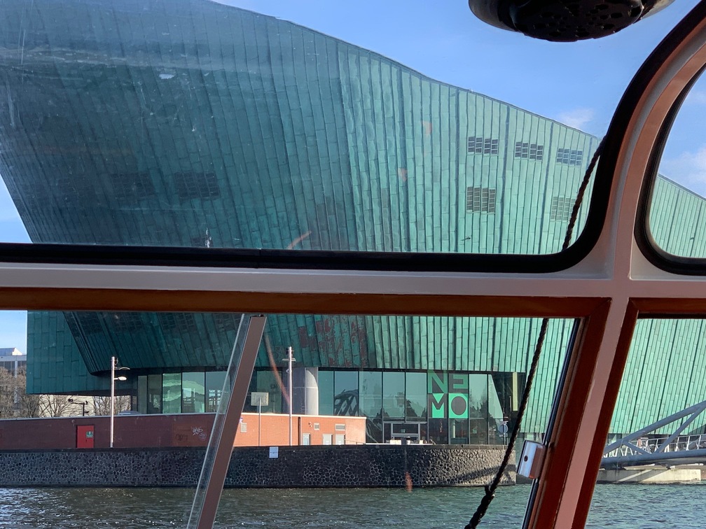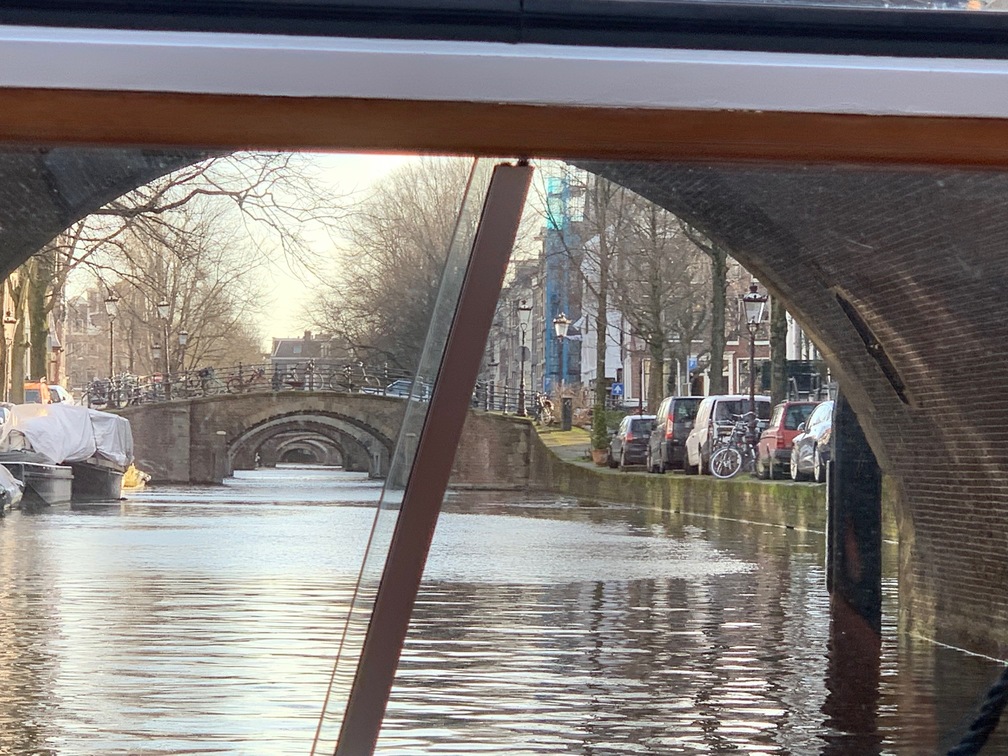 Right now, J has taken me on a city tour through Amsterdam — by canal boat of course! The captains (there are two, because one is in training) are showing us all the fancy older buildings constructed in the city’s Golden Age, during the 17th century when Amsterdam was the center of the European economy. Many of them are well maintained and extraordinarily beautiful, from a time when if you had money, you showed it through good stone, craftsmanship and detailed ornamentation. I’m having a good time.