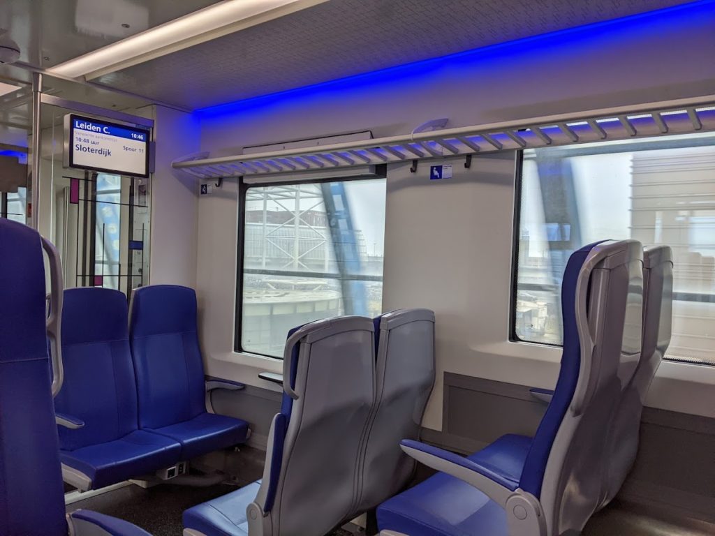 The inside of a train; there are three pairs of blue-upholstered seats on the far side, the farthest pair facing back toward the camera and the other two pairs facing forward.  The walls and backs of the seats are various shades of grey,  There is a luggage rack above the seats, and a strip of blue soffit lighting below the ceiling.