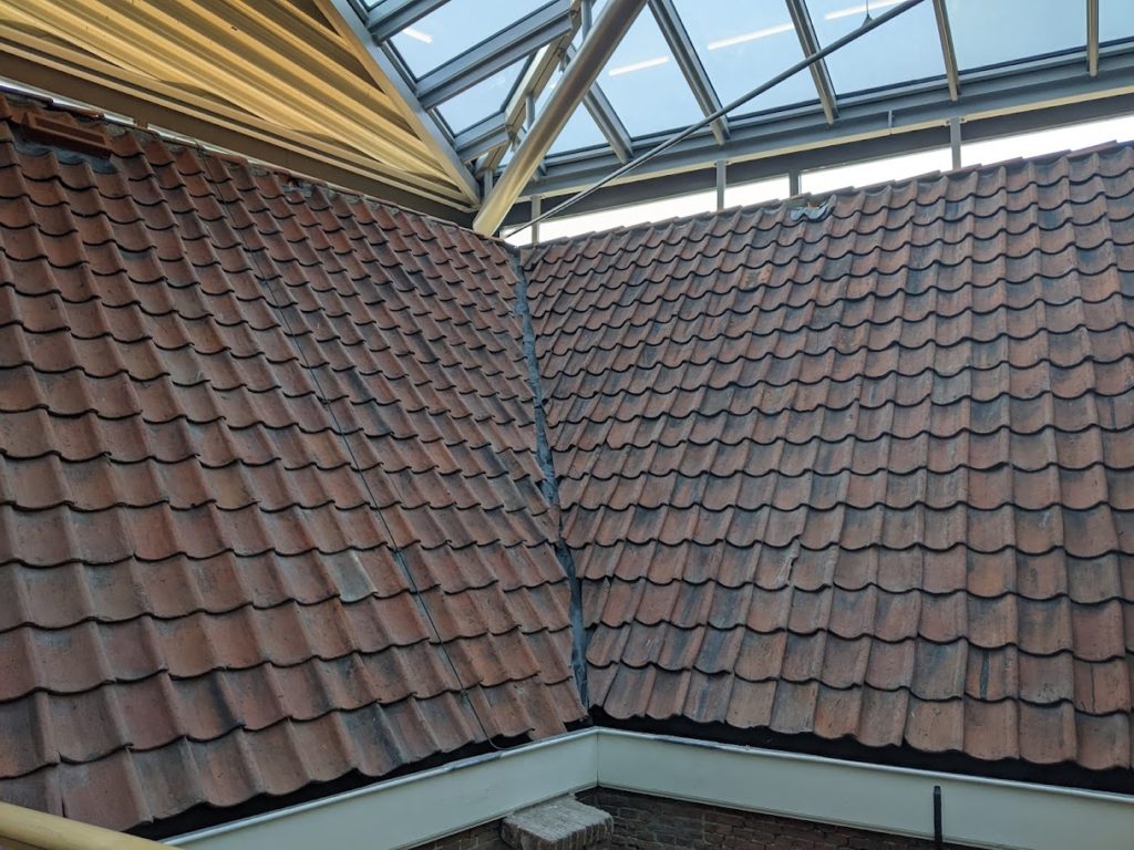 An inside corner of what was once a courtyard, with roofs covered with brown tiles sloping away from the camera. A corner of the modern glass roof can be seen at the top of the picture
