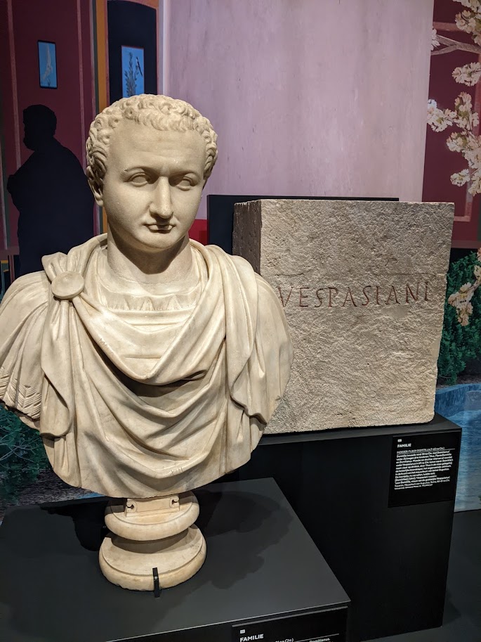 On the left, a bust of a man with short curly hair and a disapproving expression, on the left.  On the right, a block of stone on which is carved the name "Vespasiani".