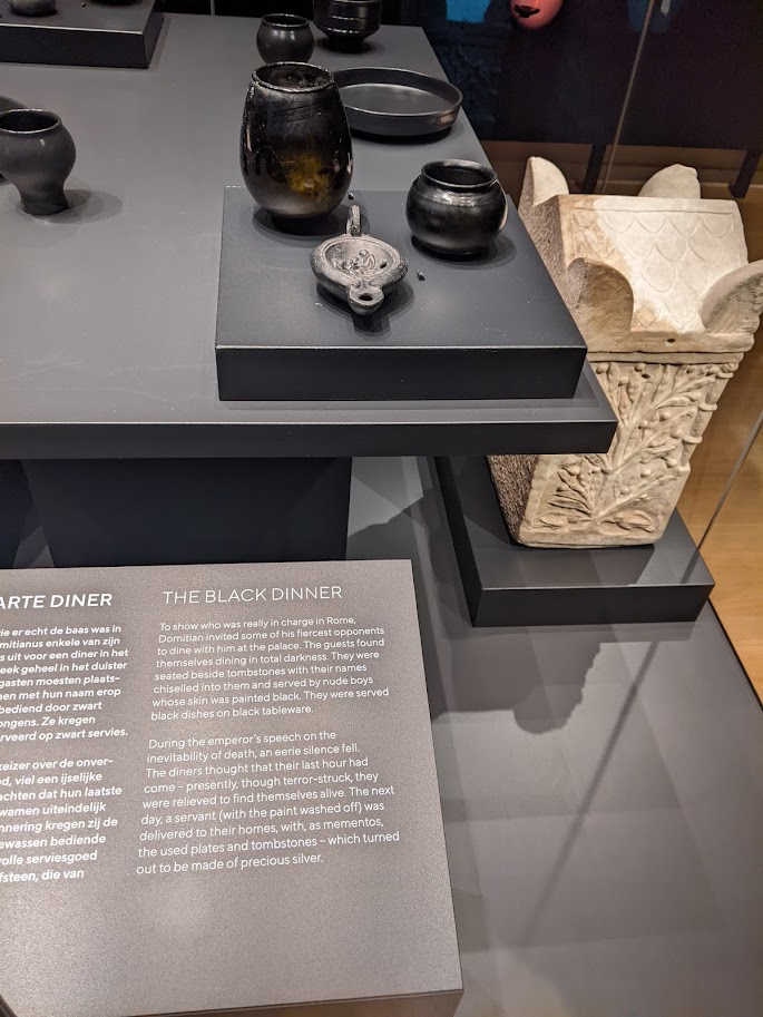 The museum also contained an extensive temporary exhibit on the Roman emperor Domitian, second son of the emperor Vespasian. Vespasian won the imperial crown by being a successful general, but had no familial link to the Caesars. Domitian, without the ancestry to cement his hold on the throne by the traditional route, went on a massive campaign of building in order to make himself seem more like a legitimate emperor. The people and the army loved him. But he was dictatorial in the extreme with the Senate, who didn’t appreciate this from an upstart without lineage, and eventually they had him assassinated for it. The exhibit about his life borrowed items from many countries, and it was fascinating — Domitian was not an emperor I had ever known much about before, which I gather was their point in making an exhibit about him: most people don’t. A well-balanced explanation of a complicated and interesting man. The exhibit on his life included items from his infamous Black Banquet, which was one of the most impressive pieces of social terrorism I’ve run across in quite a while, and I was fascinated to learn about it. (Especially since the items themselves, all entirely black, were both beautiful and chilling.)