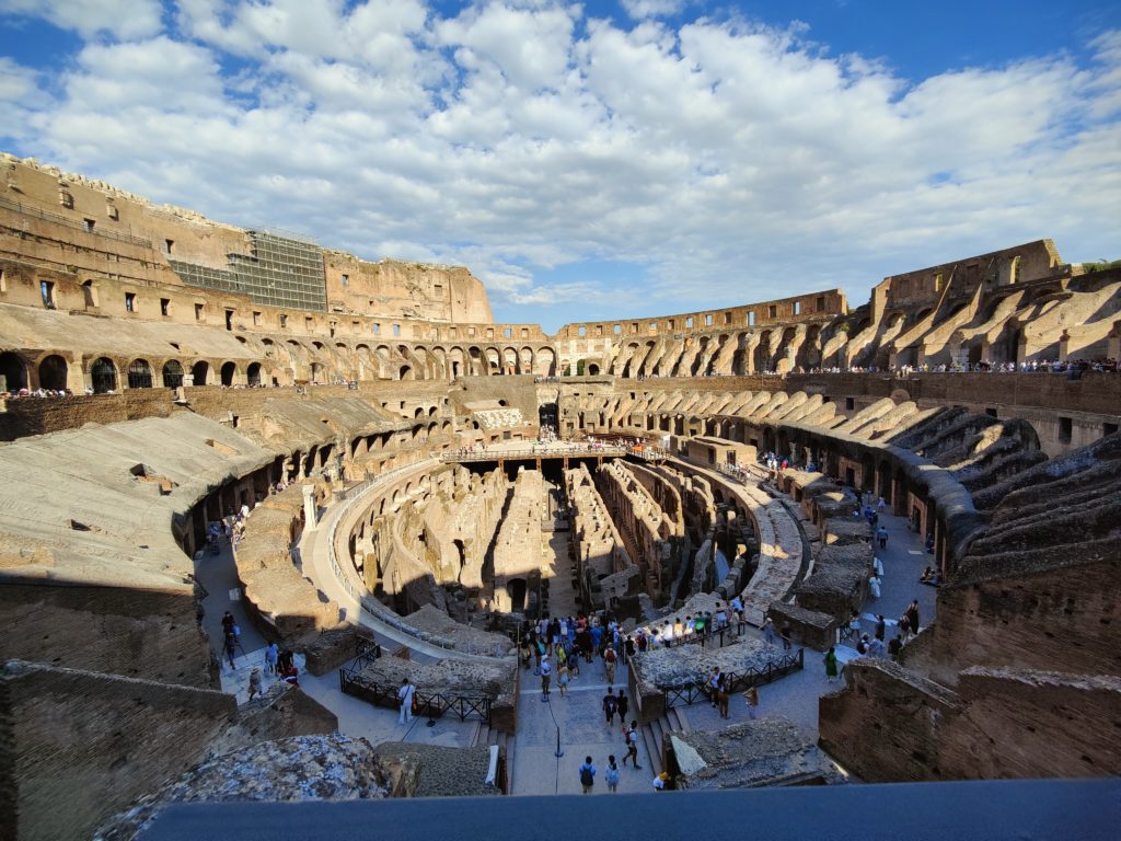 We went on to the Colosseum itself. Also known as the Flavian Amphitheatre, because it was begun by the emperor Vespasian and continued by his sons Titus and Domitian, the three emperors of the Flavian line, the building has been badly treated by the middle ages, but partially restored in the modern day. You can tell easily by the color of the stone which parts are restoration, which is deliberate. They don’t want scholars, or even casual visitors, to be confused about what is genuine ancient Roman and what is modern replica. But the replica does give one a bit of an idea of what it might all have looked like when it was new.