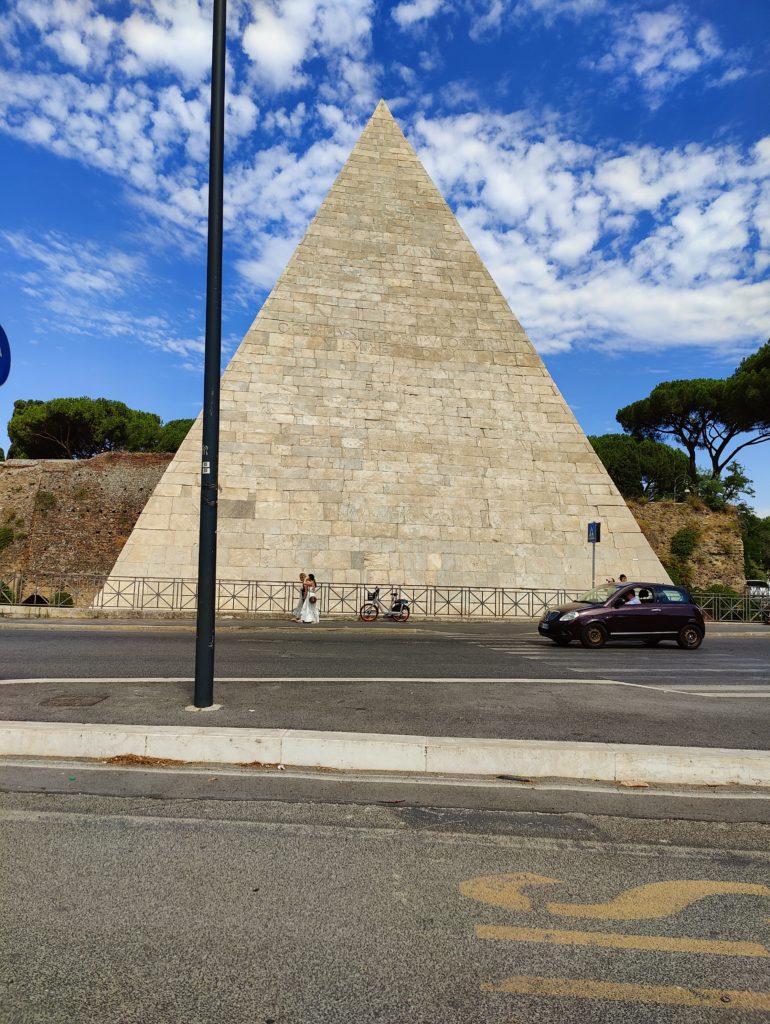 In ancient times, this area might have been outside of Rome proper. But today it’s right smack in the middle of town, and these temples were casually surrounded by apartment buildings and cafes and shops. It was incredibly cool to take a random corner and find ourselves staring at 2,500 year old temples. There was a similar instance where we passed the Aurelian walls (put up in the time of the emperor Aurelian, about 275CE), and found a pyramid built right into them. Apparently this was the pyramid of Cestius, a tomb built for a Roman magistrate in the early imperial age, around 12 BCE. I’m not sure why Gaius Cestius decided to have his tomb built in the style of the Egyptian pharaohs — one hypothesis is that he was a general in the Nubian campaigns, and has his tomb built in the style of the tall, sharp-pointed Nubian pyramids in honor of that achievement.