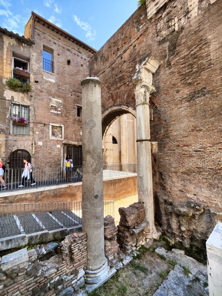 In addition to the ancient pieces built into the everyday houses around us, there were random elements of ancient archaeological sites all around us. There was the very old and important temple of Apollo Sosianus with a few pillars still standing, right in the middle of the Jewish quarter, with ordinary houses and restaurants all around it. The ancient temple of Bellona, one of the Roman gods of war, had been right beside it and some bits of that were still standing as well. It was, we were told, where the triumphal processions began, on the Campus Martius just outside of the old city; they would wind into the city proper and around through it to finish at the temple of Capitoline Jupiter. It’s important that this spot was not strictly within the ancient boundaries of Rome, because both the temple of Bellona and that of Apollo, for different reasons, had to be outside of the city limits. Apollo was a foreign (Greek) deity, even though widely worshipped by Romans, and Bellona was a war god whose temple could not violate the sacred peace of the city. So both were placed on the Campus Martius, where a lot of war-related activities were conducted just outside of town so they didn’t breach the pomerium, the sacred boundary that designated the city proper.