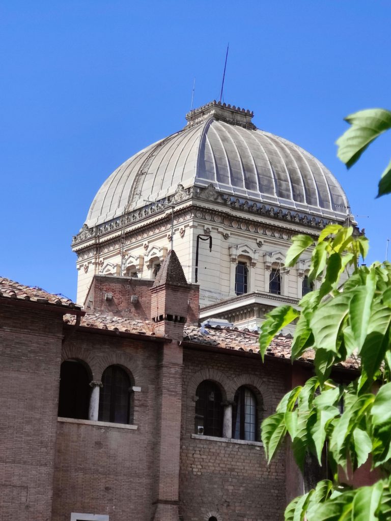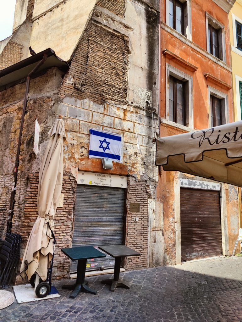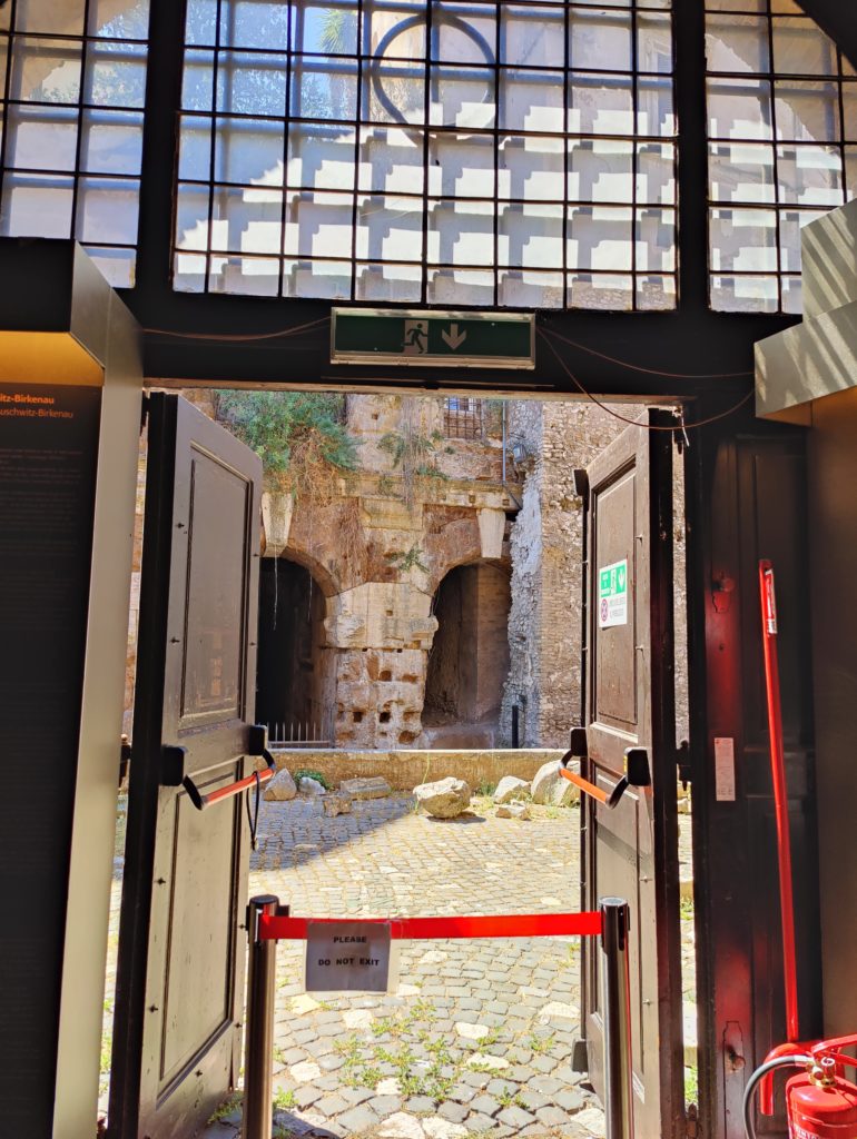 We moved on from the garden, seeing bits and pieces of things as we walked. We spent a little while in the tiny local Holocaust memorial museum, but it was designed to teach Roman families about a part of their history many don’t know. This is material J and I both knew from the cradle and which I spent my college major studying in depth. I remember looking out a door that was wide open to allow the breeze to circulate, but with a barrier across indicating no exit, and feeling a little like a caged bird. With J’s consent, I asked our guide if we could leave a little after that. There’s only so much horror I’m typically in an emotional condition to take without preparation.