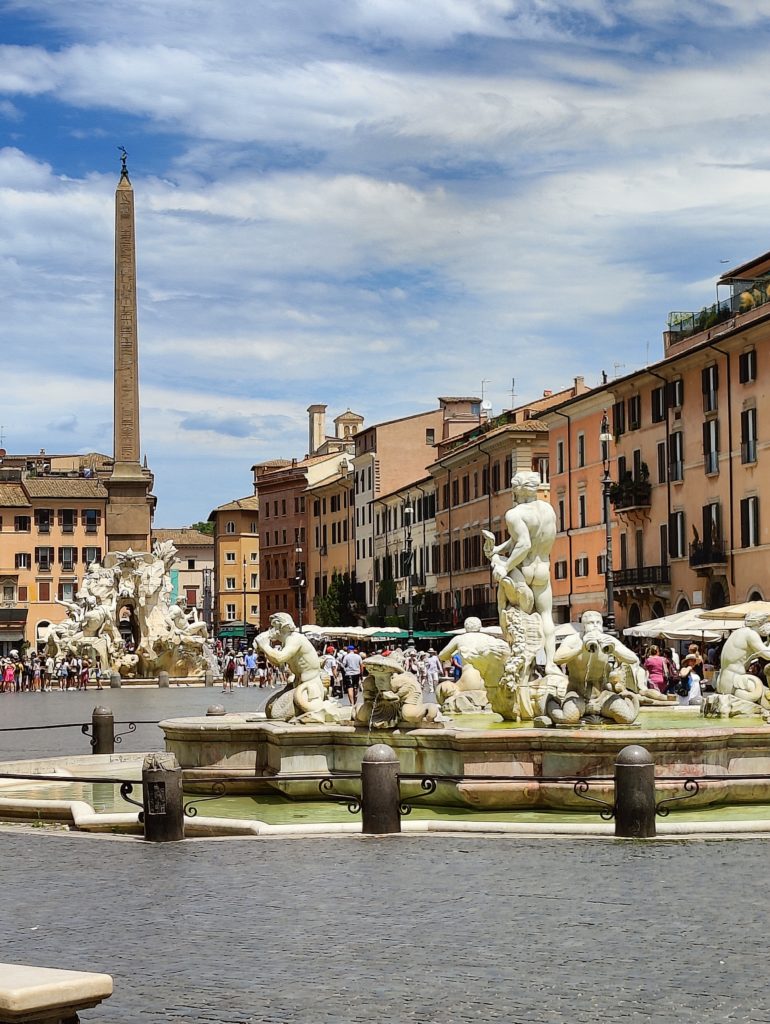 Navona Square, or Piazza Navona in Italian, is the site of an ancient athletic stadium. You can absolutely tell this from the shape, which isn’t a square at all but an oval that’s very like a modern setting for track and field events, with the street around the outside of it and a big open area with fountains in the middle. Carolina said that the Christmas Market is set up here in December, with a carousel for children and stalls selling gift items. J was fascinated by the obvious track flavor to the shape, and we talked for a little about the people whose windows look out over the square imagining watching an ancient footrace from their homes, or a jogger going out in the early morning for a run around the piazza and picturing themself in an ancient race for the honor of their gods.