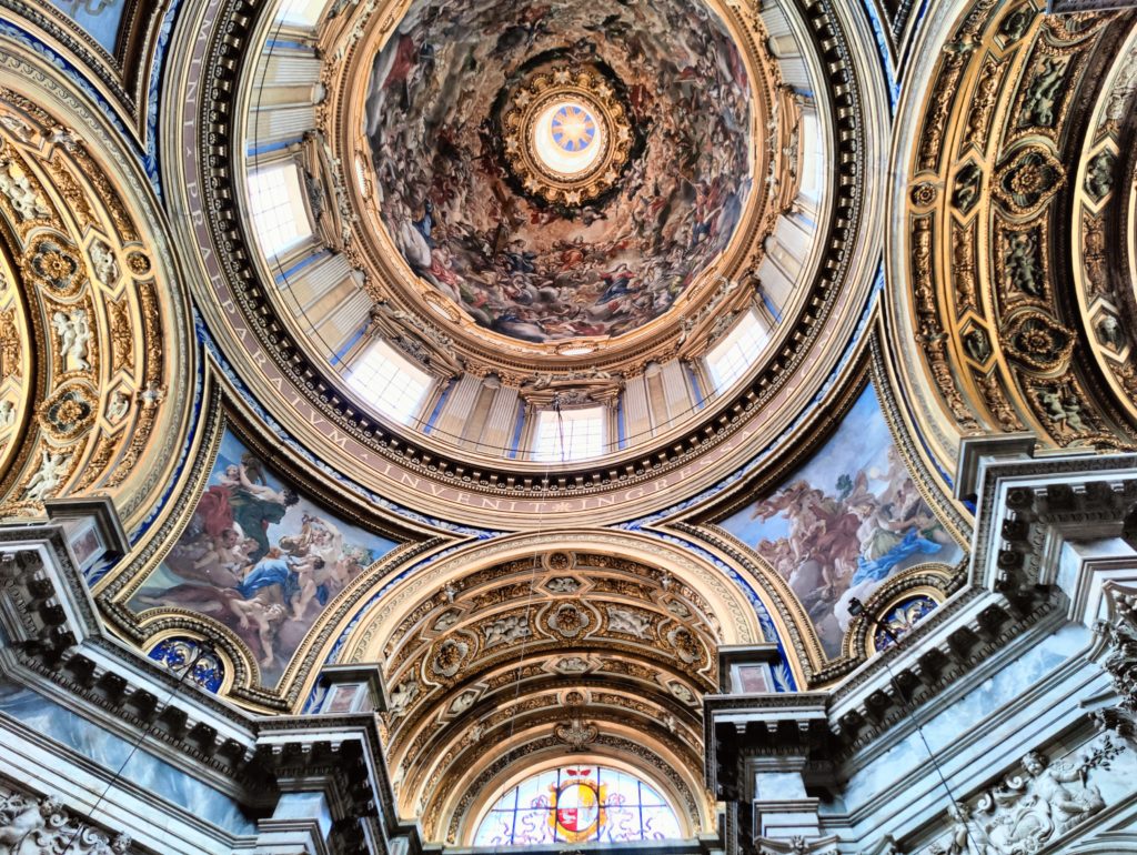 The interior of the church is ornamented to the last conceivable detail. If I ever thought the Victorians ornamented everything, it’s nothing to the baroque Romans, especially when they were putting their best craftsmanship into a church right next door to their pope’s home address and built for his at least occasional personal use. (A balcony on the side against the Pope’s palace wall allowed him to sit in on services from his own home by simply walking through the connecting door.) Altars on the sides are designated for Sta. Agnes, for whom the shrine was named, and St. Sebastian; smaller altars for less important saints were at the corners. The ceiling was decorated in jewel colors, with a cupola covered in frescoes surrounded with stained glass.