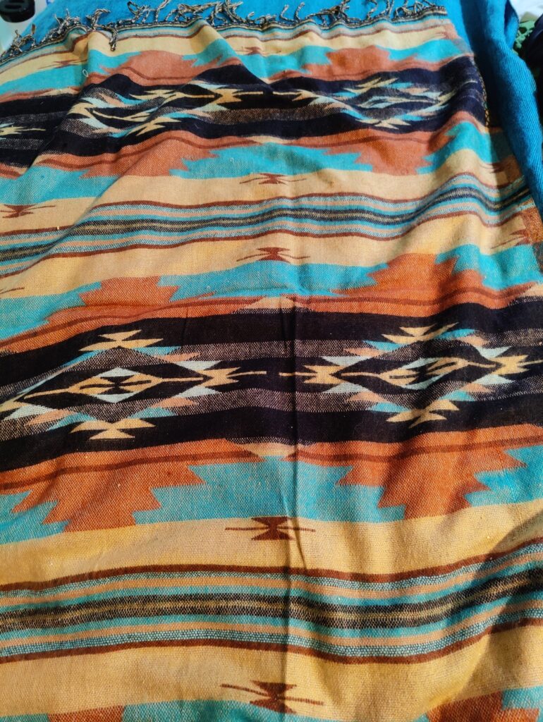 The place did have some beautiful crafts. Turquoise and silver jewelry; pottery that I would have tried to bring home with me if I hadn’t been still smarting under the disappointment of having broken something I’d bought in Italy on the way home from that trip (you’ll get that story in a few weeks), and some beautiful shawl/throw blankets, one of which I did bring home with me, and it’s on my bed right now. I bought my blanket and a couple of books. C got a blanket too, and then we climbed back into Frank and tried to make our way back to the highway.