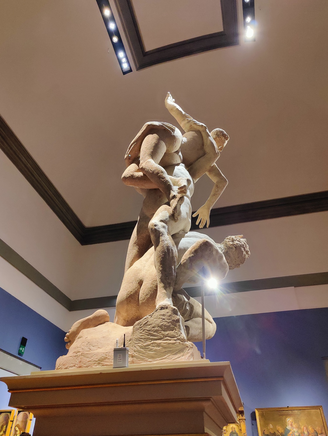 In other ways, not so much. For one thing, it has an ugly iron rod on one side, holding up the weight of the figures. That wasn’t uncommon in the sculpture of the time (though usually in marble; it was less frequent to need it even in the plaster model!), but it still sticks out like a sore thumb. Michelangelo refused to use them. He designed his pieces, whenever possible, so that they were naturally enough balanced that they didn’t need supports. When he couldn’t do that, he would make the support part of the design, like the tree stump behind the figure’s leg in the David. It was intended to help reinforce the strength of the one marble leg on which the weight of the entire statue rests…. but it’s designed so that it isn’t at all obvious that it’s there as a structural component more than as an aesthetic one.