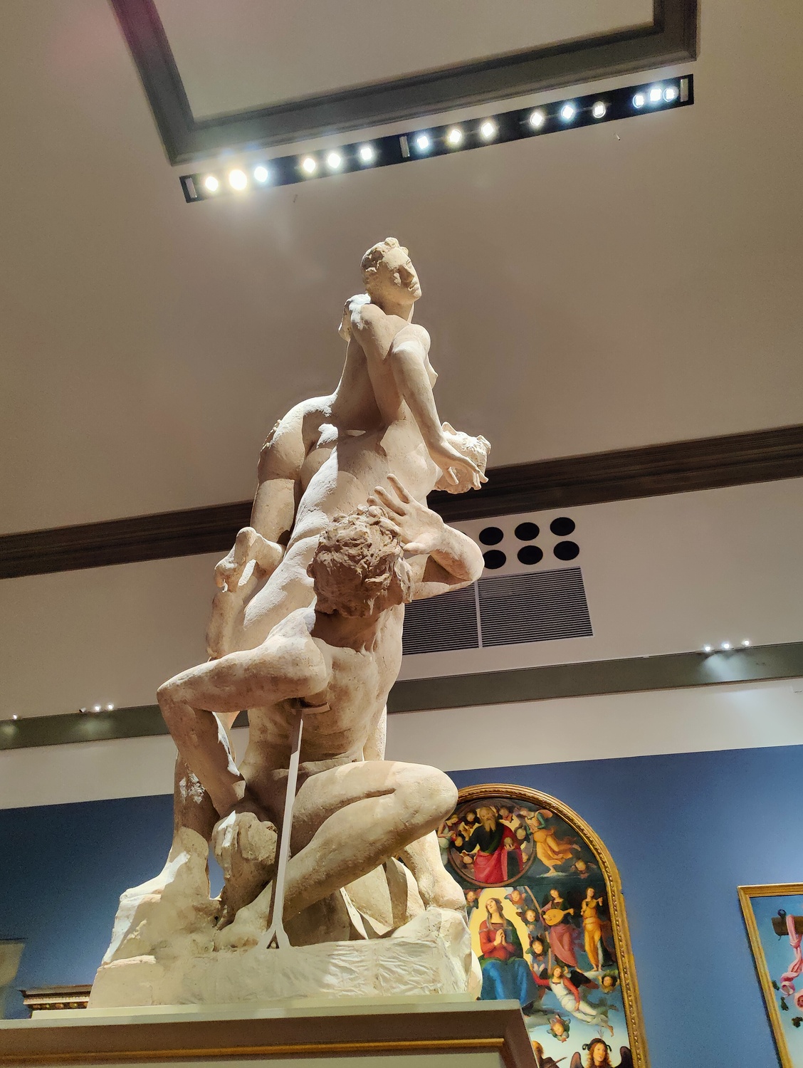 Regina pointed out to us that Giambologna had never intended to make this sculpture represent an abduction… of a Sabine woman or anybody else. The woman’s posture shows that. She isn’t fighting or opposing the man who carries her — instead, she’s ecstatic. This was an elopement. But the fashion of the time was for every sculpture to be a scene from either biblical or ancient Graeco-Roman mythology. So he had to find a scene to name it after, and the Sabine abduction was the nearest he could think of. It was officially titled accordingly.