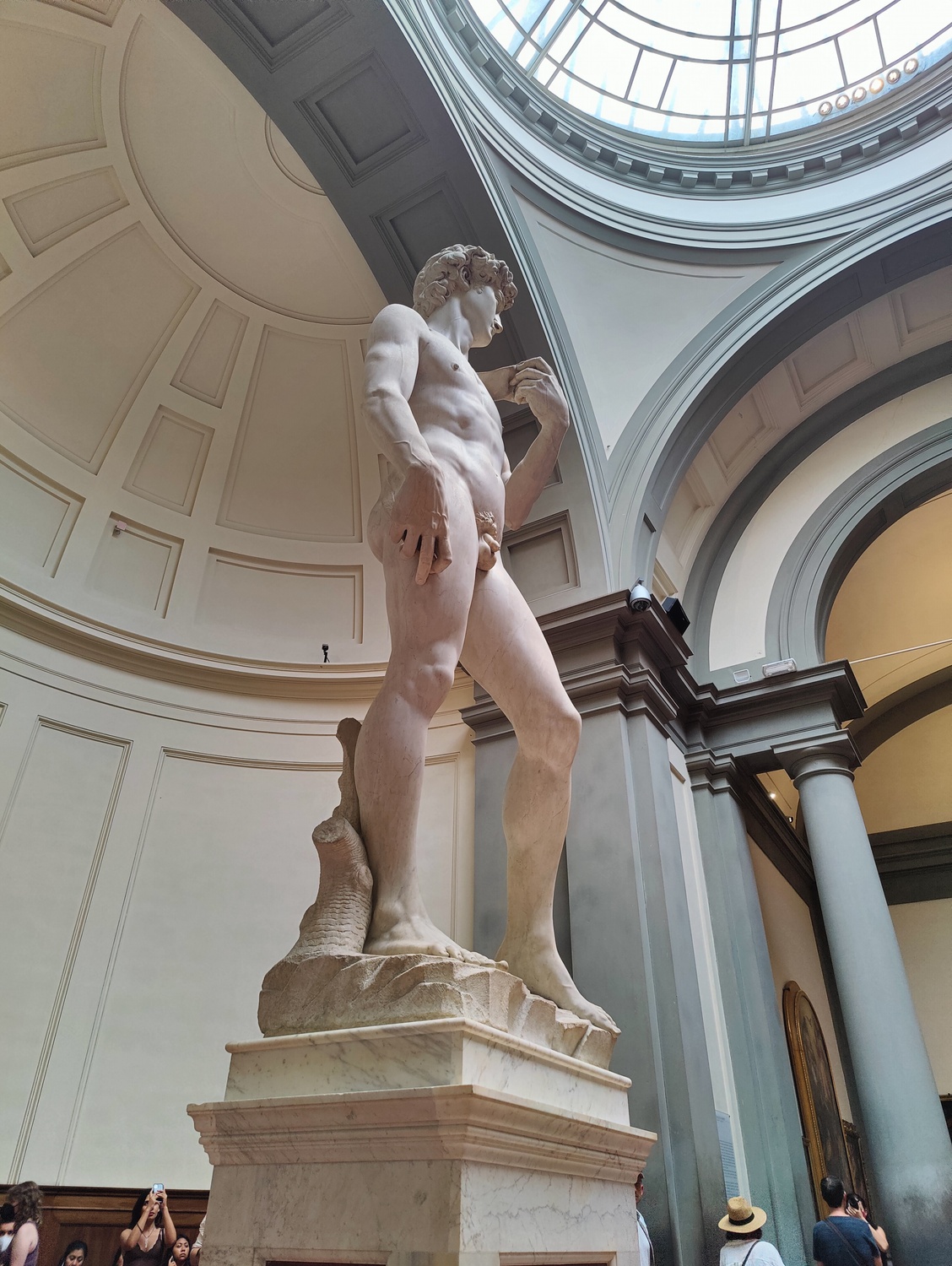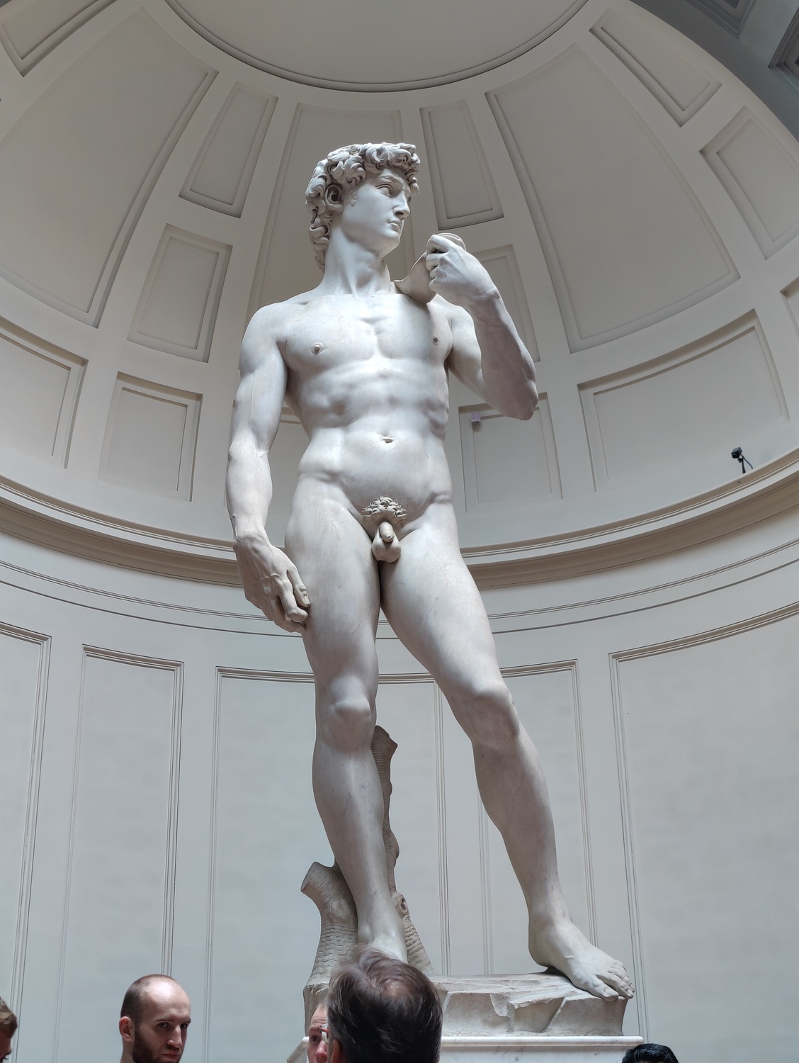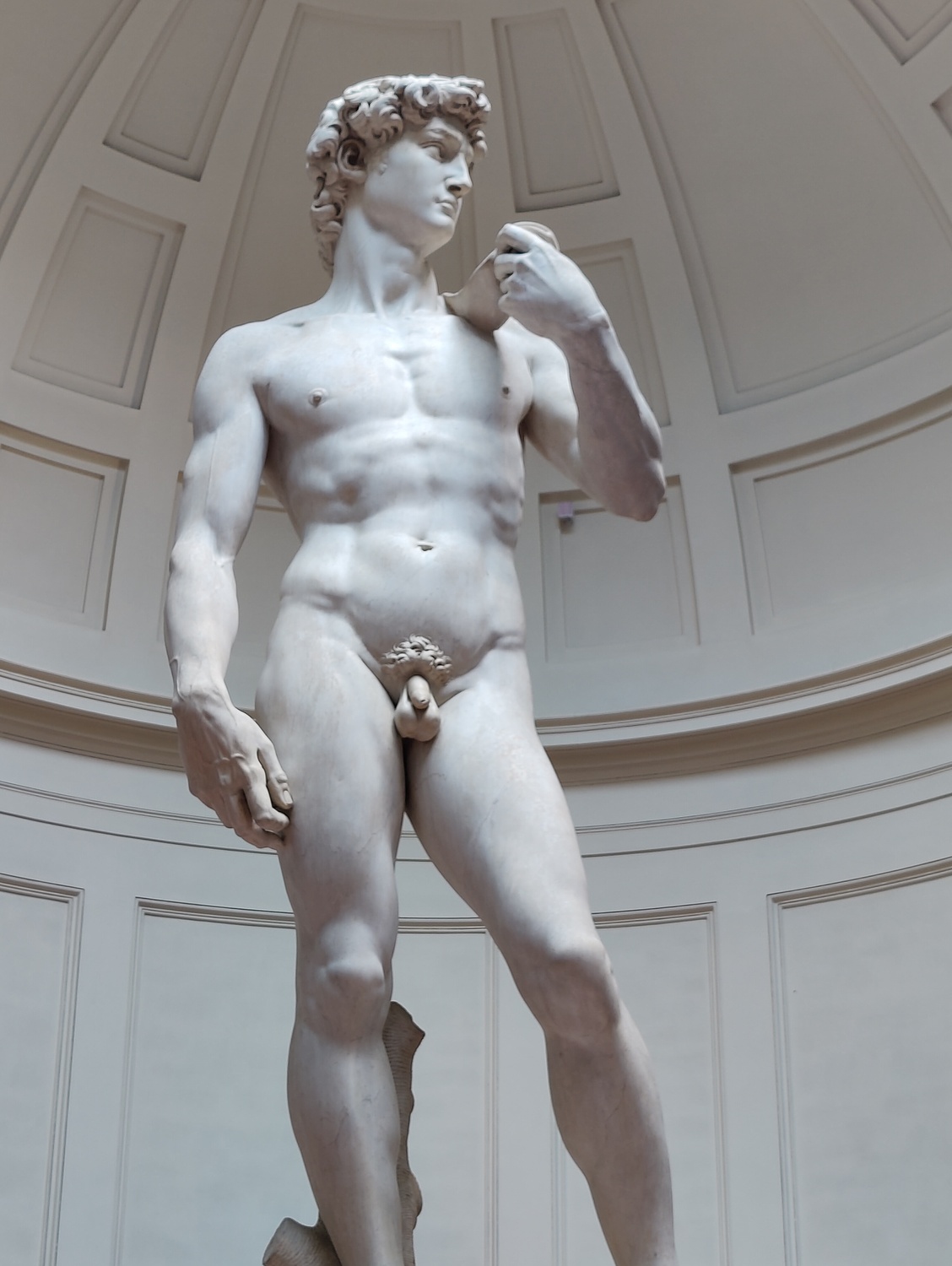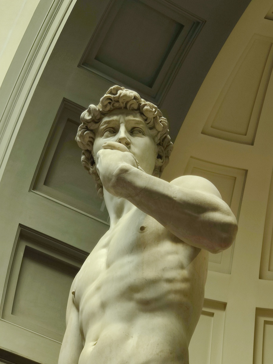 And in the end, none of it matters. David is still the most perfect stone human being ever made. As with Michelangelo’s other pieces in the round, you can walk around David 360° and every angle shows you something new. The face, which looks so calm and resolute if seen from the turned profile where the niche presents it, has the furrowed eyebrows of stress and anticipation when you come around to the right and look at it head-on. The sling lies limp down the back, but the rock is gripped in taut fingers. You can count the ridges of skin at the knuckles of the bare toes.