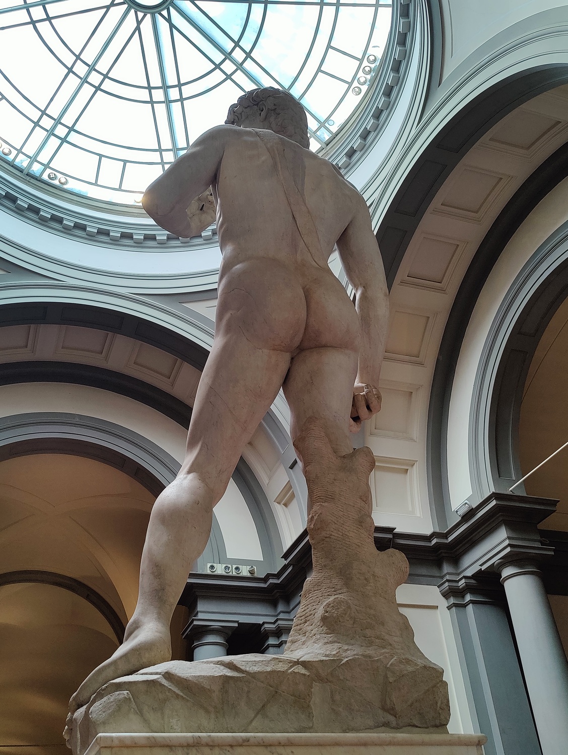 So instead of being put on the Cathedral, the David was placed in front of Town Hall. And there it stayed, from 1504 until 1873. By that time, it was starting to show small cracks from stress, and they wanted to put it in a more sheltered position. So they asked the Accademia di Firenze to house it. And they built it its very own space. Because the statue was designed to be seen outdoors, they set it up in natural light, under a glass roof. And because it had been designed to be placed in an arched niche on the side of a church (but was still built complete in the round, because Michelangelo never got so sloppy as to ignore the backs of his statues even if they were never expected to be seen), they compromised: it has an arched niche, so it can be seen from down the hall in the way it was originally intended. But when you get into the immediate area of the statue, you can still walk all the way around it, and see the back as Michelangelo sculpted it.