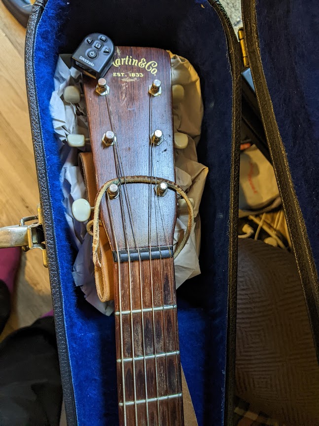 One slightly awkward problem is that your guitar will most likely be sitting lengthwise at the back of the bin, and other passengers will be trying to put things in front of it. Offer to help them. You can also put something of your own in front of it, your coat if nothing else. If you’re traveling with a medical device like a CPAP or a mobility aid like a folding walker or four-footed cane, use that. If you’re traveling with someone else, you can coordinate your carry-ons; my wife used to travel with a large dufflebag that went on the back of her scooter. Another trick is taking a bulkhead seat, which means that all your luggage has to fit overhead, so you can fill the space in front of your guitar with your backpack and so on. This works especially well if your travel companion is handicapped.