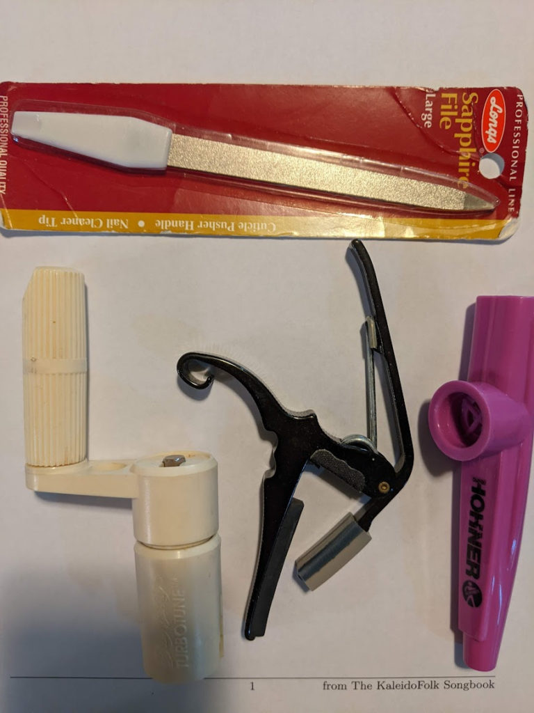The obvious accessories to pack are a capo, a set or two of strings, a string-winder (a crank-like gadget that makes it a lot faster to change strings), several sets of whatever kind of picks you use, and a clip-on electronic tuner. (You can use a phone app for tuning, but it’s awkward holding the phone, plucking the string, and tuning.) The kazoo is optional.