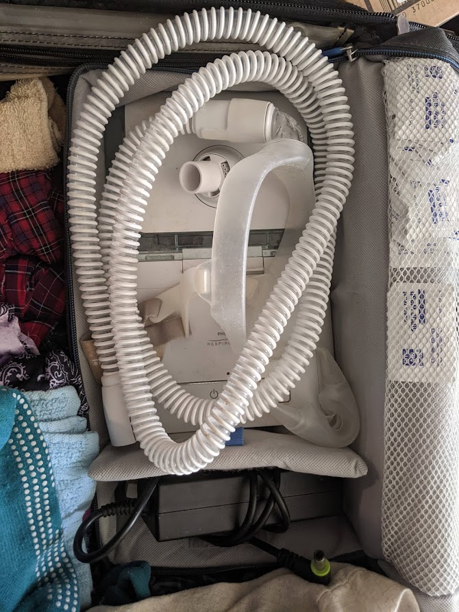 Sleep apnea is a sleep disorder in which one stops breathing — anywhere from a few seconds to a few minutes– several times a night. Often this is accompanied by loud snoring. It isn’t generally considered a disability; it won’t get you a handicap parking spot in the airport parking lot, early boarding at the